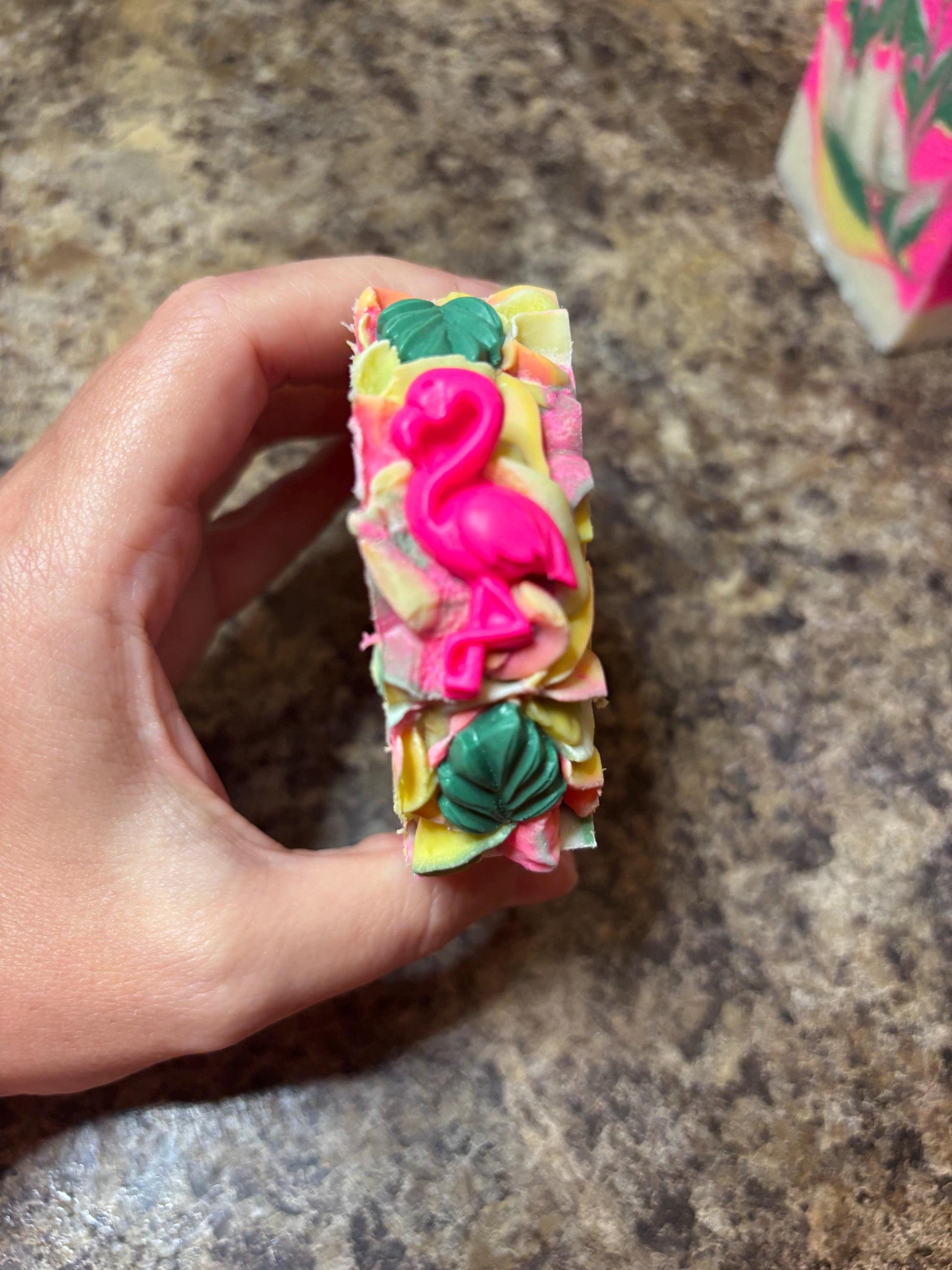 It’s a pink, yellow, green and white bar with soap piped on top with a little pink flamingo and tropical leaf embeds!